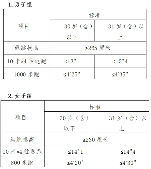 体能测试项目包括纵跳摸高、10米×4往返跑、男子1000米跑和女子800米跑,凡应测项目中任意一项不达标的,即为体能测试不合格。